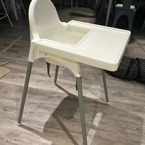 Høy spisestol til barn, med både spisebrett og bøyle. Stolen har seler.