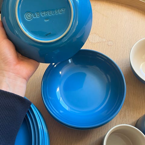 Le Creuset keramisk bolle i rød farge. Egnet for bruk i kjøkkenet til servering eller tilberedning av mat. Lite brukt, se bilder