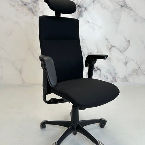 Stolen har høy rygg med netting som gir god støtte og ventilasjon, justerbar høyde samt armlener for ekstra komfort.