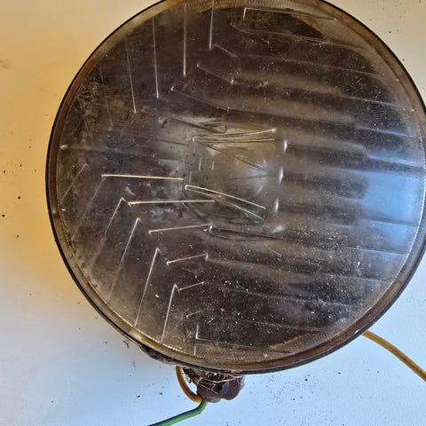 Selger en original eldre traktorlykt med ERMA-merket glass, produsert for bruk på traktorer og landbruksmaskiner midt på 1900-tallet.