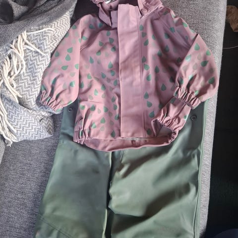 Skikkelig fin vanntett Wheat regndress størrelse 80, men god og romslig i størrelse. Lett, slitesterk og komfortabel å ha på. Med regulerbar og avtagbar hette, refleks og fotstropper, perfekt å bruke i all slags vær ☺️