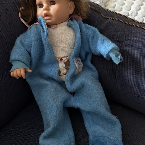 Selger denne nydelige baby-dukken i Orginal klær fra 70-tallet. Lukker øynene når den skal sove. Myk kropp med ben og armer i fast materiale. I god stand.