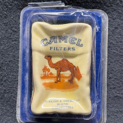 Selger et originalt vintage askebeger i porselen med klassisk Camel Filters / Turkish & American Blend-motiv. Utformet som en sigarettpakke, med ikonisk kamel og retro fargepalett.