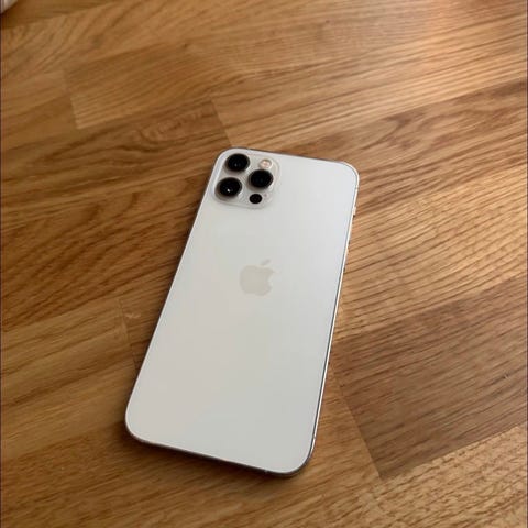 Apple iPhone 12 Pro mobiltelefon med 128 GB lagringskapasitet. Enheten har en skjerm med flat kantdesign og trippel kamera på baksiden. Fargen er mørk, nærmere bestemt grafitt eller lignende. Noen få bruksmerker, men ellers veldig pent brukt. Batterikapasitet på 80%.
