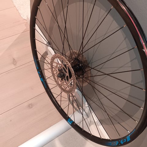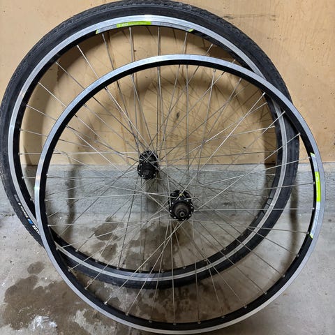 l.Selger et 28" sykkelhjul med et Shimano 8-trinns tannhjul og skivebremser. Nytt dekk med universalprofil. Fås uten dekk.