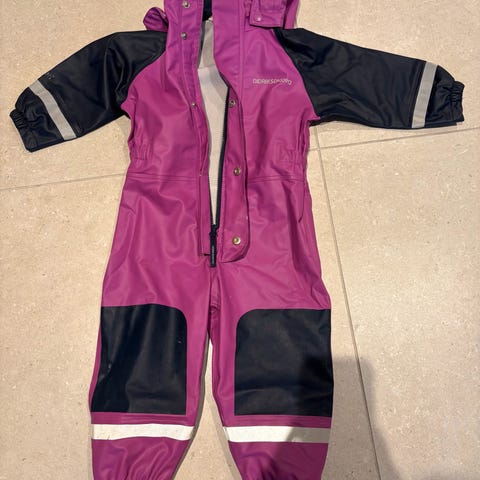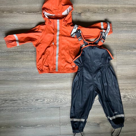 Bestående av regnbukse m/seler, regnjakke, votter og sydvest.