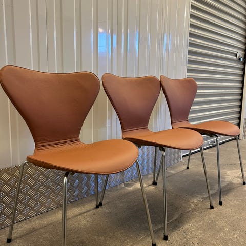 Selger tre stk Fritz Hansen produserte Syveren. Arne Jacobsen klassiker syveren i teak med stålrør ben. Orginal fra 60-tallet. Teak fint bevart. God svikt i ryggen. Originalt feste av ben under. Passer til bruk i spisestue, kontor eller som ekstra sitteplass.