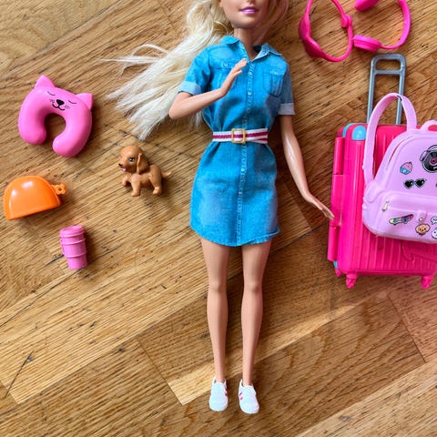 Jentene har blitt store og selger nå sitt barbie dukkehus, med møbler og noen barbies, hester, bil mm.
