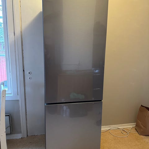 Samsung kombiskap med fryser i rustfritt stål. Kjøleskap og fryser er integrert i kjøkkeninnredning. Kjøleskapet kan også benyttes uten innredning.