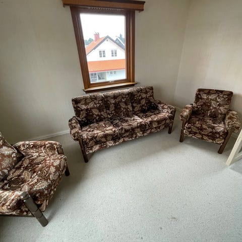 Lys beige sofagruppe. Sofaene er strukturelt i veldig fin stand, men trenger nok en god vask på putene (se bilder).
