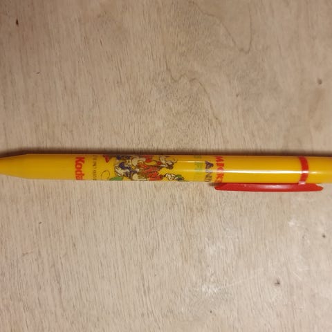 Kodak metallskilt med reklame, laget av aluminium. Skiltet har en rektangulær form med slitt utseende og farger i rød, gul og svart. Skiltet er produsert i Kina og har skarpe kanter.