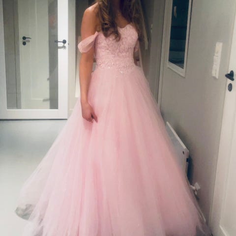 Nydelig ballkjole med korsett og snøring i ryggen, pyntet med blonder og paljetter. Kjolen er fra Alexandra Ritzi i en dus pudderrosa farge. Kjolen har flere lag med tyll så man behøver ikke ekstra underskjørt.