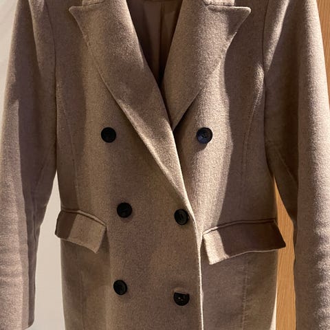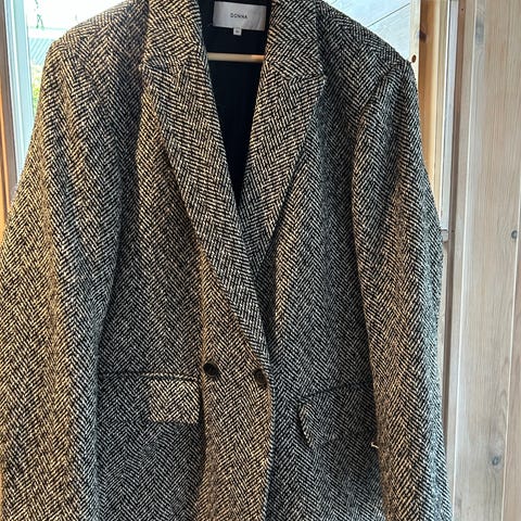 Donna blazer i størrelse 36. Jakken er svart og hvit og laget av polyester og 20% ull