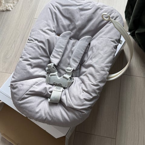 Stokke Tripp Trapp barnestol nyfødtsett i grå farge. Settet er designet for å gi støtte og komfort til nyfødte i Tripp Trapp-stolen, med polstret materiale og sikkerhetssele.