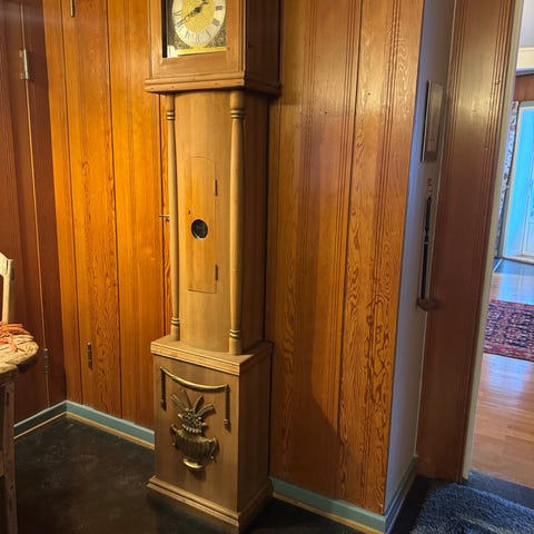 Gulvklokke i tre med utskjæringer