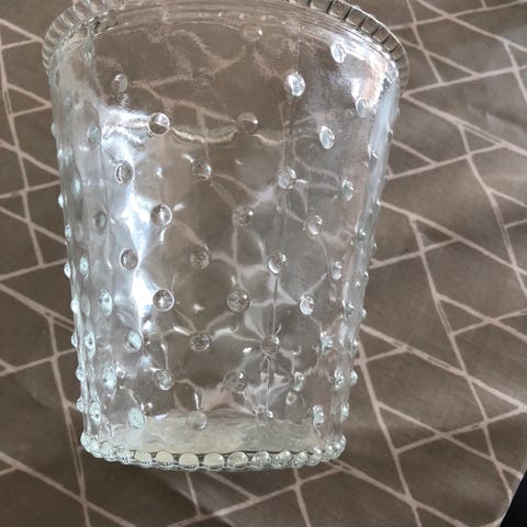 Grå blomsterpotte med hjerte. Rund og lav glassvase. Hjertevasen er solgt.