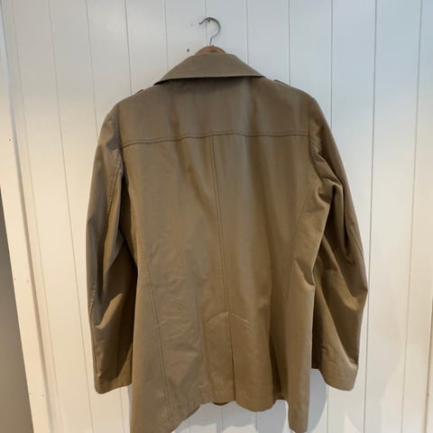 Riccovero jakke i beige farge, laget av polyester. Jakken er designet for menn og har størrelse 52. Den har hette med fuskepelsfôr og flere lommer. Passer til utendørs bruk. Helt fin uten skader, men det er bruksmerker rundt kragen og hetten.