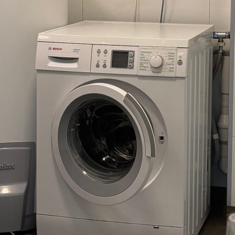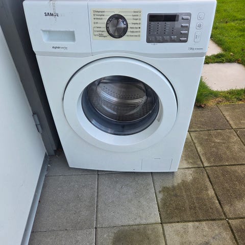 AEG Toppmatet vaskemaskin med hvitt kabinett. Maskinen har en trommel for vask av klær og manuell betjening med dreiebrytere for temperatur og vaskeprogrammer. En liten lekkasje ved skylling. Gis bort mot henting.