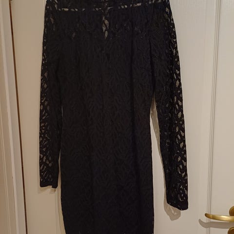 Bik Bok kjole i størrelse XS, svart farge og laget av polyester. Kjolen har lange ermer og åpen rygg. Blondedetaljer