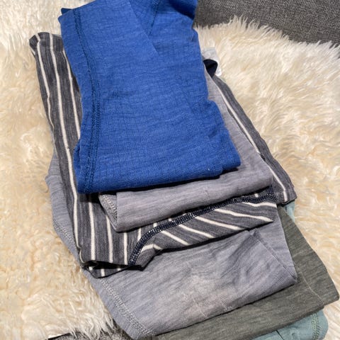 3 gensere og 1 stillongs. Blå malingsflekk på den lyse genseren, se bilde. Svak flekk på grå genser på brystet, ikke så synlig på bilde. Gode til å bruke under klær. Fra str 98-104.