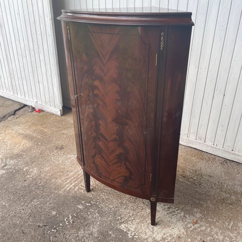 ldre skap/kommode i mørkt treverk med speil og skapdører selges. Møbelet fremstår som solid og funksjonelt, med normal slitasje etter alder og bruk.