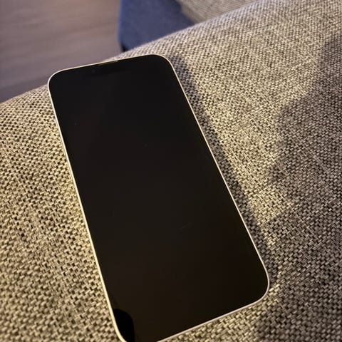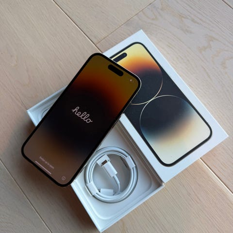 Apple iPhone 14 med 128 GB lagringskapasitet i midnatt farge. Telefonen leveres med original eske og ladekabel.