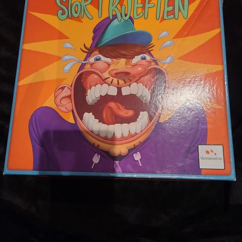 Stør i kjeften brettspill. Inneholder spillbrett, 4 munnstykker, 1 terning og 40 kort. Spill for flere spillere som går ut på å si ord med munnstykket i munnen.