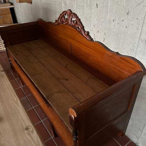 Var opprinnelig mørk brun, men er spraylakkert hvit.