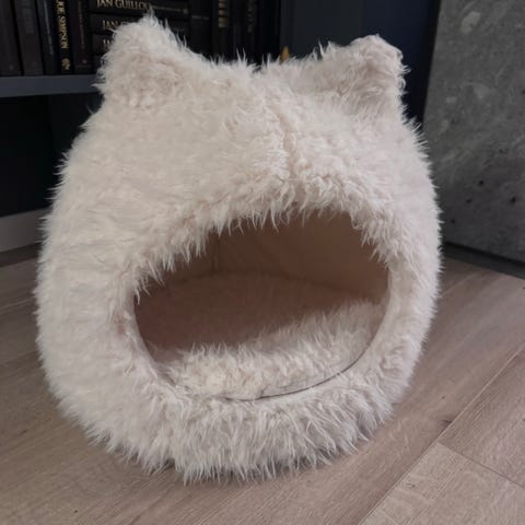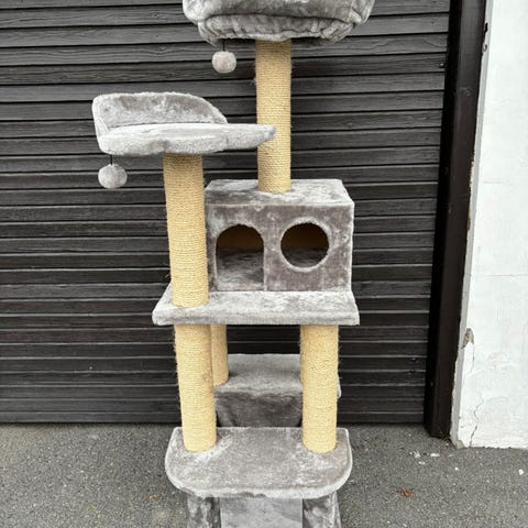 Katt klatrestativ med blå farge, høyde ca. 50 cm. Laget av mykt materiale som gir komfort for katten. Inkluderer hule og klorestolpe for kloring og hvile.