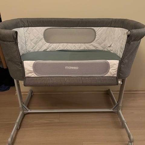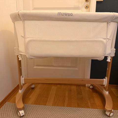 Pent brukt Moweo bedside crib med hvit tekstil og lys treramme. Ingen flekker. Pris kan diskuteres v/hurtig handel. Må hentes i Klæbu. Ny pris 1799,-