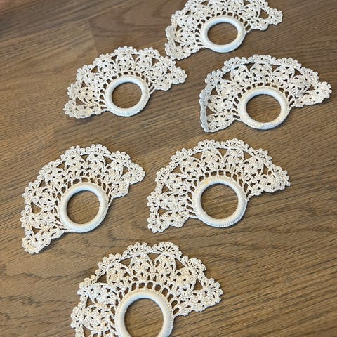 8 hyggelige serviettringer som er hekla. Oppbevart i eit koselig etui