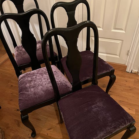 Antikk trestol med polstret sete i rødt stoff og polstret rygg med dekorativt mønster. Stolen har utskårne armlener og detaljer i treverk. Egnet for bruk som spisestol eller pynte stol i stue eller kontor.