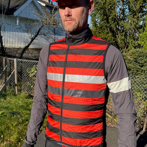 Lite brukt. Selges da jeg har for mye sykkeltøy. Rapha Sykkelvest for herre i størrelse L. Vesten er mørkebrun med lett foring, egnet for bruk under sykling når det er kjølig, vår og høst. Reflekser rundt. Ingen lommer.