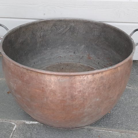 Kobbergryte med to håndtak, stor og rund form. Egnet for oppbevaring av f.eks ved eller som dekorativ gjenstand. Materiale: kobber. Stativ medfølger.