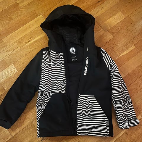 Volcom skibukse og jakke for barn eller ungdom, størrelse 12 år. Settet består av svart jakke med stripete detaljer og svart skibukse med lommer og bib.