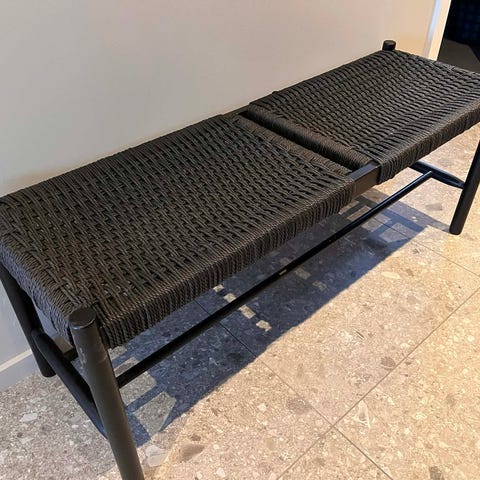 Benken har noen skader i flettingen langs sidene. Dette skyldes en misforståelse hos husets to katter. Skadene er kun kosmetiske og påvirker ikke bruken. Flettingen er hel og sitter godt. Bildene gir en god gjengivelse av skadene.