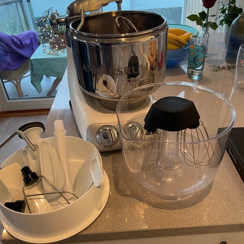 Ankarsrum Assistent Original kjøkkenmaskin med bolle i rustfritt stål. Leveres med flere tilbehør for ulike kjøkkenoppgaver. Designet for effektiv miksing og elting.