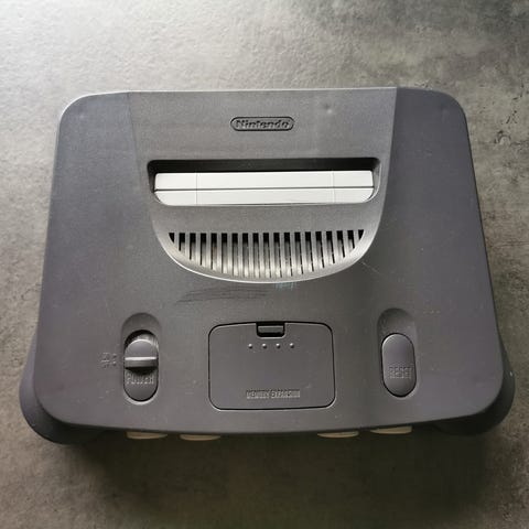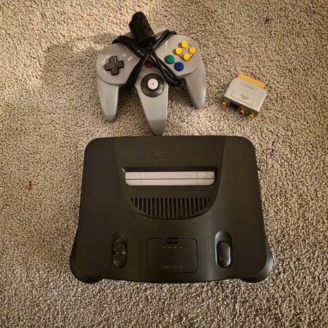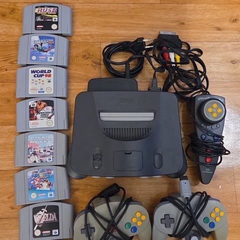 Nintendo Nintendo 64 spillkonsoll med standard strømadapter og AV-kabel. Konsollen har noen bruksmerker og riper, men fungerer som dennskak