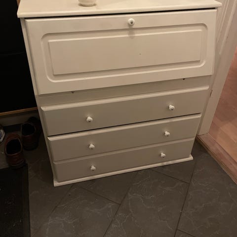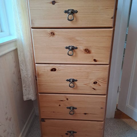 Selger en kommode da jeg ikke har plass pga flytting. Skuffene funker som de skal. Ett par bruks merker som du kan se på bildene :)