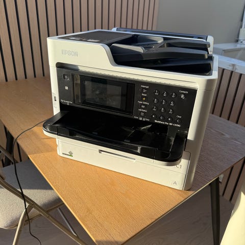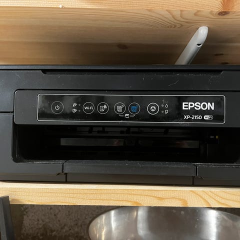 Uten blekkpatron. Printeren har ikke vært brukt fordi det ikke har vært nødvendig. Vi har kun brukt skanneren. Det kan også være nødvendig å rense skrivehodet siden skriveren ikke har vært brukt på lenge.