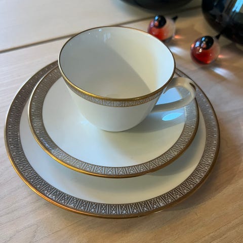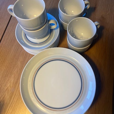 Rørstrand kaffeservice Galaxy - som nytt. Består av 10 stk. asjetter (den ene er litt mindre enn de 9 andre), 9 kaffekopper (kun den ene har et lite skår) og 8 skåler. Dette serviset har stått i skapet i alle år, og har kun vært tatt frem til familiebursdager.