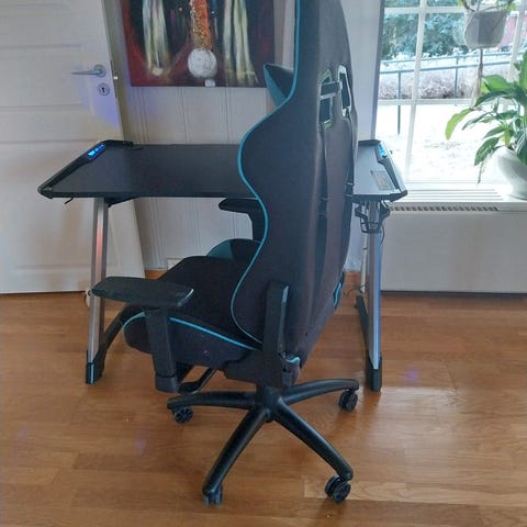 Cepter Rogue Gamingbord med LED-lys langs sidene og USB-porter for tilkobling av enheter. Bordet har en svart overflate og et robust stativ med Z-formet design. Egnet for spill og databruk.