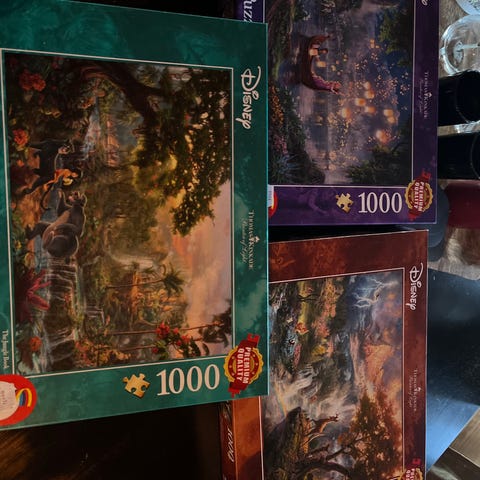 Schmidt Disney Puzzle med 1000 brikker. Motiv med Disney-tema, inkludert slott og karakterer i et eventyrlig landskap.