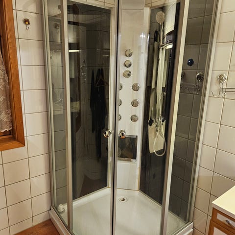 Dusjkabinett med flere massasjedyser, hånddusj og glassdører. Innebygget sete og kontrollpanel for vannstråler. Kabinettet har en hvit bunn og mørke glassvegger.