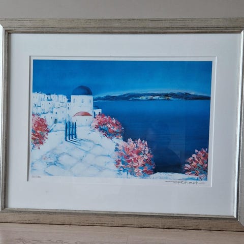 Fenech litografi med motiv av et hvitt hus ved sjøen, nummerert 289 av 390. Bildet har fargerike innslag med rødt, blått og grønt, og er innrammet i en mørkgrå ramme.