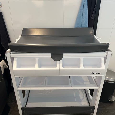 Brevi stellebord med badekar og oppbevaringshyller i grå farge. Inkluderer polstret stellematte med mønster. Praktisk design med flere nivåer for oppbevaring av babypleieprodukter og tilbehør.