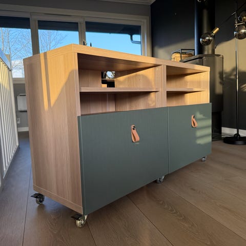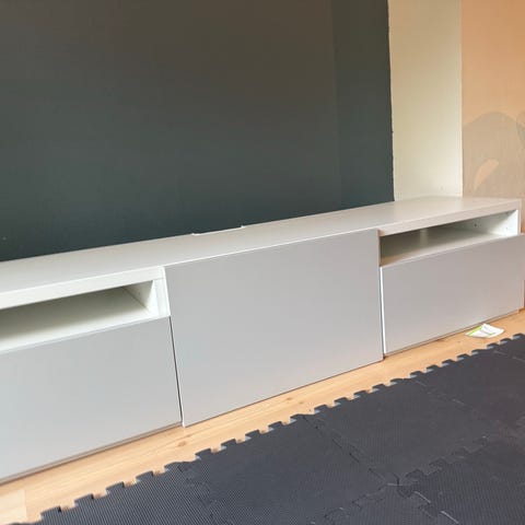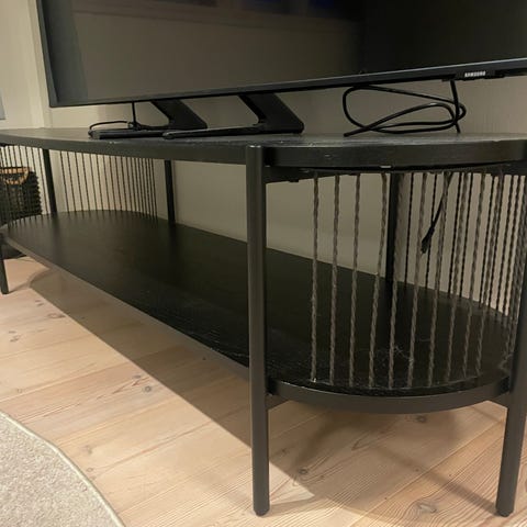 Selger pent brukt tv benk fra bestå. Kjøpt brukt på finn tidligere men byttet fronter. Tidligere eier har kappet i den bak for ledninger se bilde. Selges for 1500kr. Kommer fra røykfritt hjem men har hund