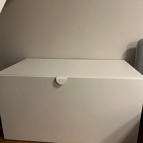 IKEA barnemøbel oppbevaringsboks med rosa front og hvit topp og sider. Designet for oppbevaring og organisering i barnerom.