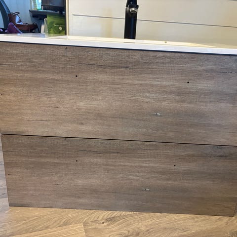 Baderomskap i hvit farge. Skapet har to skuffer og inkluderer tilbehør for montering og installasjon. Passer til oppbevaring i baderom.