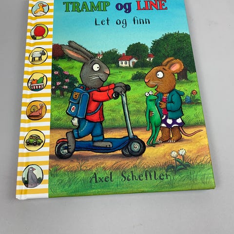 Axel Scheffler Let og finn på gården barnebok med illustrasjoner og oppgaver for barn. Boken inneholder bilder av gårdsdyr og gårdsaktiviteter, og har sider med oppgaver som å finne og telle ulike elementer på gården.